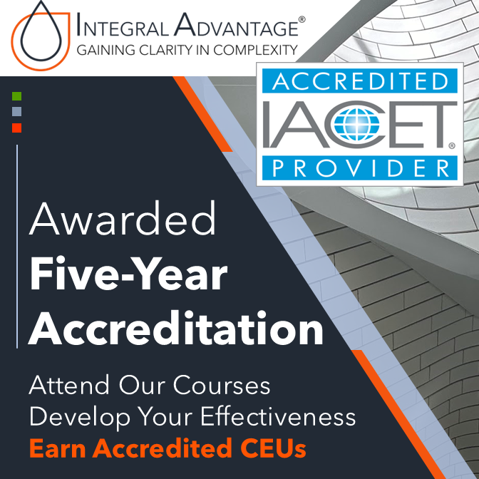 It is official! We are delighted to announce that Integral Advantage® has been awarded a five-year accreditation by IACET, the International Accreditors for Continuing Education and Training. After the lengthy and rigorous accreditation process led by our CAO Charlotte Wang, MA, EDD(c), we are now able to issue accredited Continuing Education Units (CEUs) to our course portfolio participants upon successful program completion.
